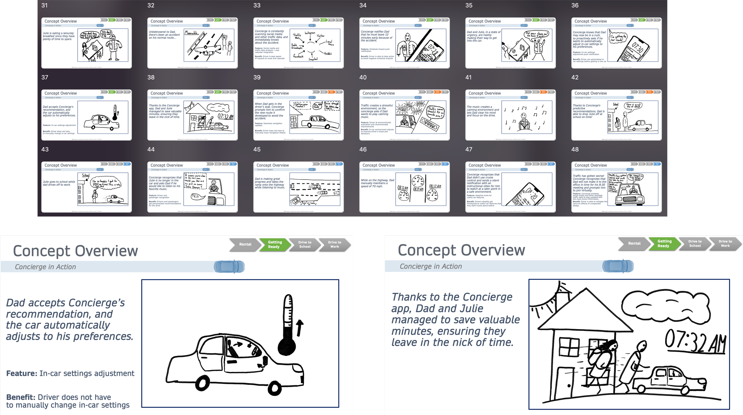Bringing our Idea to Life: In order to effectively communicate our idea and its benefits to our client, we developed a storyboard that showcased an example in-car customer journey.