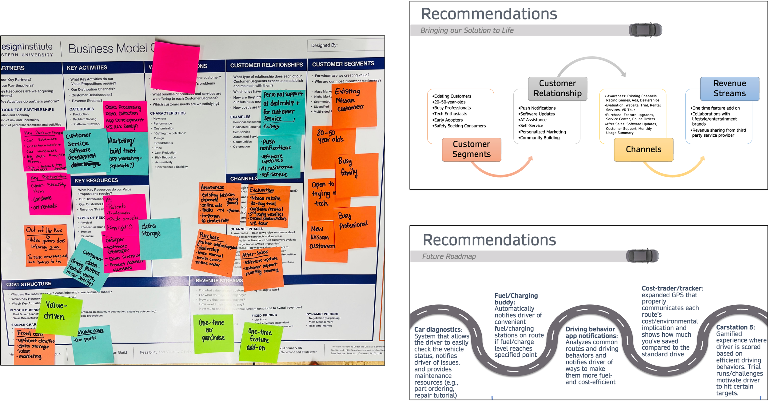 To complete the "desirability, feasibility, viability" framework, we built out the business model canvas to express our concept's value proposition, costs and revenues, customer segments, key activities, and future roadmap.